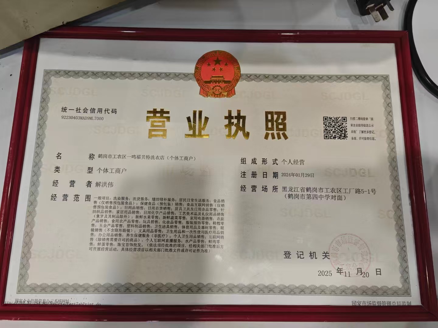 鹤岗市工农区一鸣福贝特洗衣店(个体工商户)